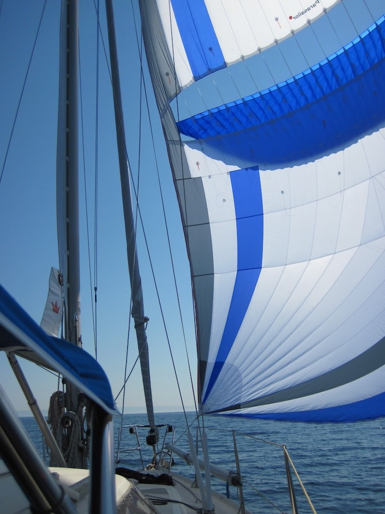 Das Gross hoch und mit fast vier Knoten bewegen wir uns. Die Genua passt nicht richtig zum Wind, also alles runter und den Parasailor ausgraben. Kurze Schote und er steht. Cool.