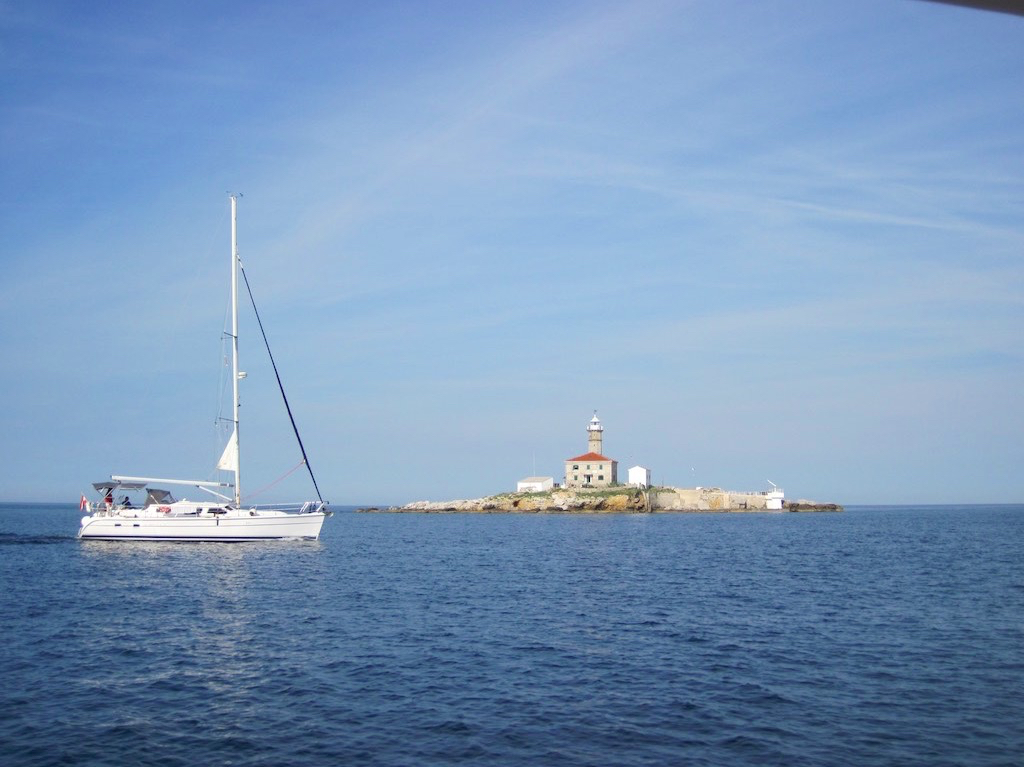 Ja, das war etwas viel Trubel! Wir hauen ab und verdrücken uns in Richtung Pula und dort in die Veruda Soline. Um acht laufen wir mit SE 5.1 kn aus der Marina von Rovinj aus. Zuerst am Leuchtturm Sv. Ivan vorbei gegen Süden.