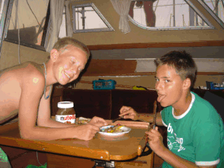 Nach einer gelungenen Ankunft im Hafen kochten Sever und ich den Znacht. Es gab Spagetti mit Pesto-rosso Sauce und zum Dessert gab es Bananenschiffli.