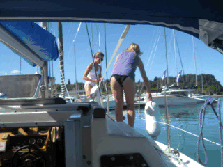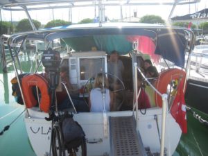 Aber was ist das? Schon will ein Italiener neben uns rein und verhängt sind in unserer, einziger Muring die noch hält. Er bedrängt die Girls die Muring nur kurz loszulassen. Ich rufe Jasmin nur zu: Sicher nicht! Und machen am Heck weiter. Jetzt kommt auch noch Joel zum Einsatz. Aber auch er kann den Knoten nicht lösen. Oder besser, die Muring von unserer Welle lösen.