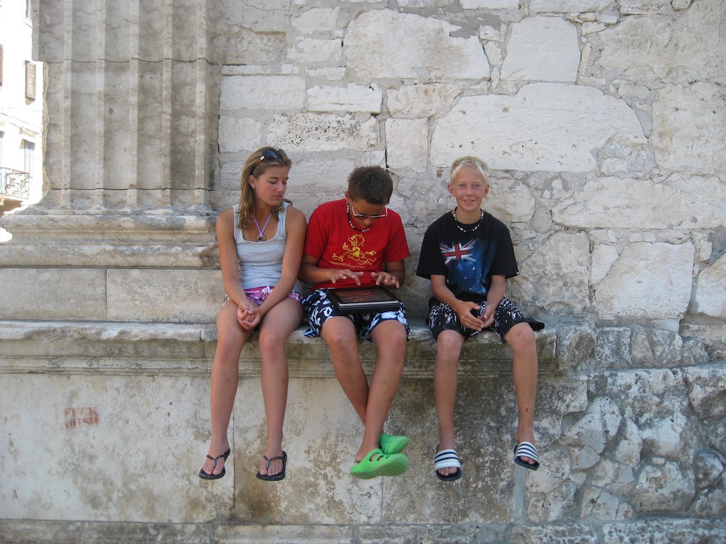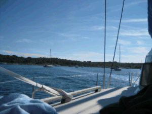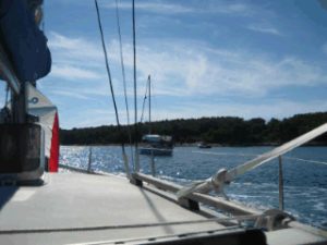 Rund um den letzten Zipfel von Istrien und schon sehen wir unsere neue Bucht. Portic wird sie genannt. Schaurig schön. Es hat schon ein paar Boot vor Anker, aber es hat noch genügend Platz für uns. Dann geht die Reparaturen los. Der Niedergang hat die letzte Stufe verloren. Bei der Badeleiter fehlt eine Mutter und zum Schluss wird noch die Ankerwinschplatte angezogen. Jetzt habe ich aber ein Bier verdient. Die Kids sind schon lange am baden und Gaby schaut dem treiben zu. Es spritzt von allen Seiten.