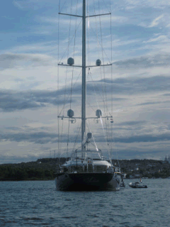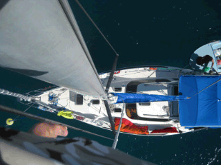 Drei Uhr. Es hat genügend freie Bojen und ruckzuck stehen wir still. Was für eine Hitze. Jetzt merken wir erst wie warm es überhaupt ist. Alles wird aufgebaut und zum ersten mal essen wir was. “Solange habe ich noch nie nichts gegessen!” wird verkündet. Der Appetit ist gross, sehr gross und alles wird verschlungen. Ich bin irgendwie auf den Felgen. Nur noch kurz das nötigste, zB warum lässt sich die Genua nicht mehr aufrollen und klemmt, erledigen. Joel auf den Masten und nachschauen.