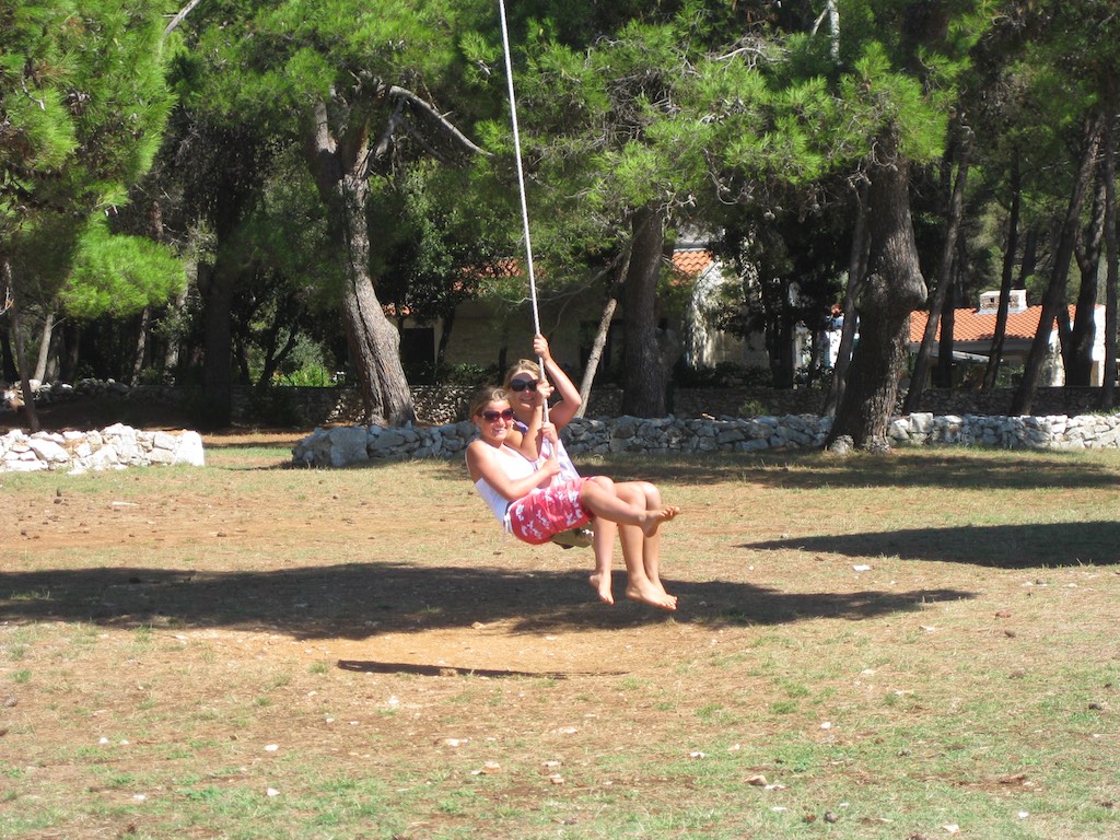 Leider können wir ihn nicht besteigen. Er wird als Wohnung vermietet und jetzt sitzt gerade eine gross Familie im Garten und ist am Grillen. Die Kids haben aber schnell einen Ersatz gefunden und vergnügen sich mit den beiden Baumschaukeln. Girls just want to have fun!