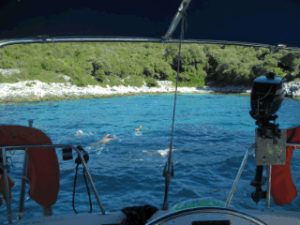 Schnell das 888’er Buch hervorkramen und schauen, wo wir hin können. Wir haben schon über 25 Meilen auf der Logge stehen und wollen eigentlich nicht mehr weit. Genau, da muss es doch in der Nähe eine Bora-Sichere-Bucht haben. Die wollen wir nun suchen. Nord-Westlich finden wir eine einsame Bucht. Genau für ein Boot gedacht. Das Wetter sollte stimmen und so gibt es nur eines, Landleinen. Die Kampfschwimmer vor! Mit dem Ankertau bewaffnet, eigentlich das einzig lange ganze Ding das wir noch besitzen, schwimmen die Boys an den Strand. Ich setzte die Büx in den Wind und die Girls lassen den Anker fallen. Acht Meter. Sehr gut. Die Leine ist aber noch nicht ganz fertig und so warten wir bis sie ans Boot ankommt. Als ich feststellen muss, dass auch die 50 Meter Ankerleine nicht reicht, springt Jenny mit einer Verlängerung den Boys entgegen. Schnell einen Knoten und schon liegen wir fest in dieser einsamen Bucht. Gut gemacht! Jenny hat nur bedenken wegen ihrem Knopf. Ich will in nachher noch kurz checken. Sehe aber, dass er von weitem ganz gut aussieht und verzichte darauf. Sever sucht noch kurz nach unserem Anker und bestätigt den guten Sitz.