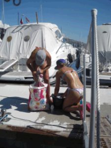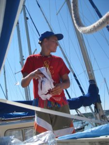 Waschtag ist das Motto. Das letzte Mal wurden wir verregnet und jetzt ist es stahlblau und fast 30 grad warm. Jeder packt an. Die Girls am waschen auf dem Steg und die Boys setzten die Wäscheleine übers Boot und hängen das nasse Zeugs auf. Heute sehen wir das erste mal auch Nachbarn die “unsere” Technik übernommen haben.