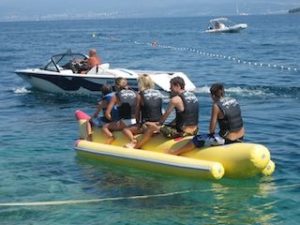 Heute war es etwas harzig mit aufstehen. Wir hatten um neun am Strand abgemacht zum Bananen-Fahren. Noch kurz ein Kaffee, Tee oder nur etwas Wasser und schon watscheln wir ab. Die Freunde sind alle schon da, aber die Enttäuschung ist gross, als wir erfahren das die Banane erst um elf fährt. So was machen wir? Warten natürlich, sagen die Kids einstimmig. Sie vergnügen sind in der Zwischenzeit im Wasser oder auf der grossen Rutsche.