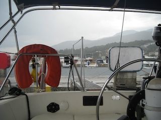 Wir essen gemütlich Zmorge und schauen dem Regen zu. Kommt er oder nicht? Der Regen hört endlich auf und ich besuche das Office der Marina. Sie telefoniert ihm, ja ja, versichern sie mir, er kommt und es ist der “Beste”. Sehr gut. Wann sollte er denn da sein? Er kann nicht selber kommen, aber seine beiden Mitarbeiter sollten um zehn da sein. Passt. Wir sind da.