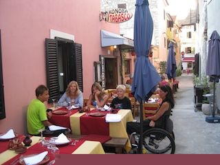 Die Kids kommen später nach. Später wollen wir in unser Restaurant zum Znacht. Leider, leider hat es zu oder es ist nur für die Hotelgäste offen. Schade. Noch kurz was einkaufen. Joel und ich bringen das Zeugs noch kurz auf die Ulalena und so müssen wir wohl oder übel eine andere Beiz suchen. Werden aber schnell fündig. In einer engen Gasse setzen wir uns an einen rustikalen Tisch. Sieht sehr gut aus. Nur der Nachbar gegenüber der Beiz ist gerade am Fernsehen und hat die Türe sperrangel weit offen. Es sind nur ein Meter! “Gpässig”.