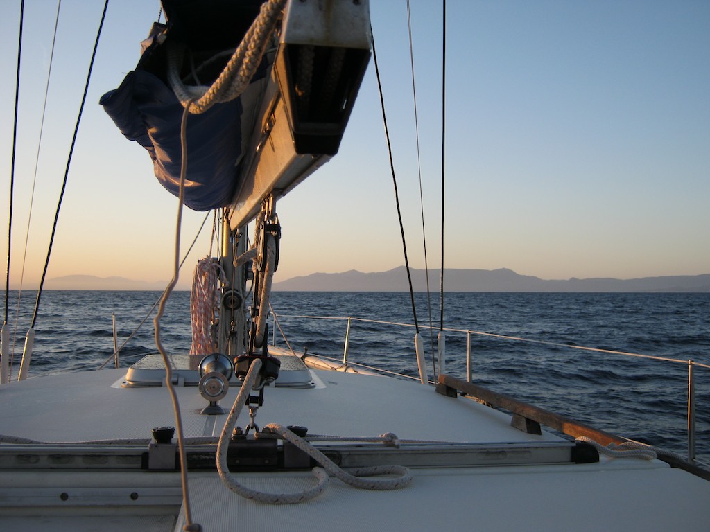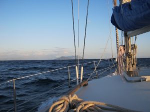 Zum Glück stimmt der Wind und die Richtung und wir düsen los in Richtung Griechenland. Die Wellen sind leider zu hoch für den Autopilot und so muss ich selber Hand anlegen. Gaby geht es gut und sie hat immer noch schön warm. Aber ich leide.