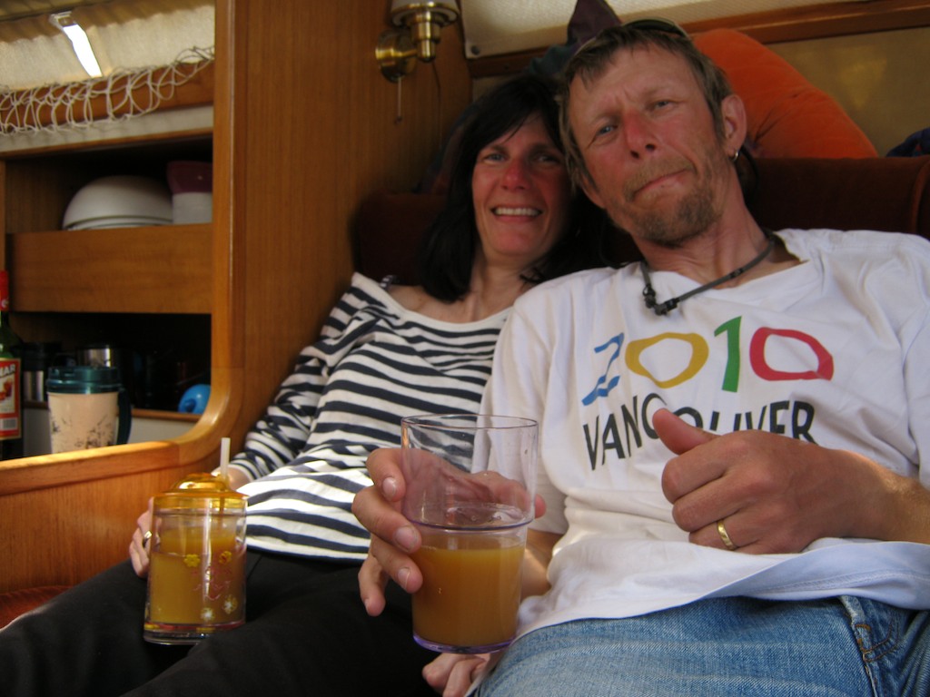 Mein Rhythmus ist ca. 5-10 Minuten. Gleich beim Niedergang lege ich mich hin und versuche mich zu erholen. Dann kurzes Aufschiessen, mit gelegentlichem Kopfanstossen, 360° Ausschau und wieder hinlegen. Gaby füttern dazwischen und sonst warten und harren der Dinge die da kommen. Die Sonne ist schon lange wach, als ich mich zum ersten Schluck Wasser zwänge und ein Zwibi reinwürge. Aber es wirkt. Zweit Stunden später turne ich wieder auf der Ulalena herum wie wenn nichts geschehen wäre. Aber die Rationen von uns beiden sind immer noch sehr bescheiden. Wasser und Zwibi. Sehr billig!