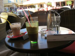Mit dem Ausschlafen hapert es noch immer. Acht Uhr, länger geht einfach nicht. Es ist hell draussen und die Leute fangen an zu werken. Mit einem feinen Zmorge fangen wir an. Dann kommt die schmutzige Arbeit wie, Bilge reinigen oder Stopfbuchse justieren. Dann endlich den Blog mit unseren unzähligen Geschichten vervollständigen und dann am Nachmittag ab in die kühle Stadt. Dieses Café-Frape ist einfach perfekt in einem Café mitten auf dem Dorfplatz.