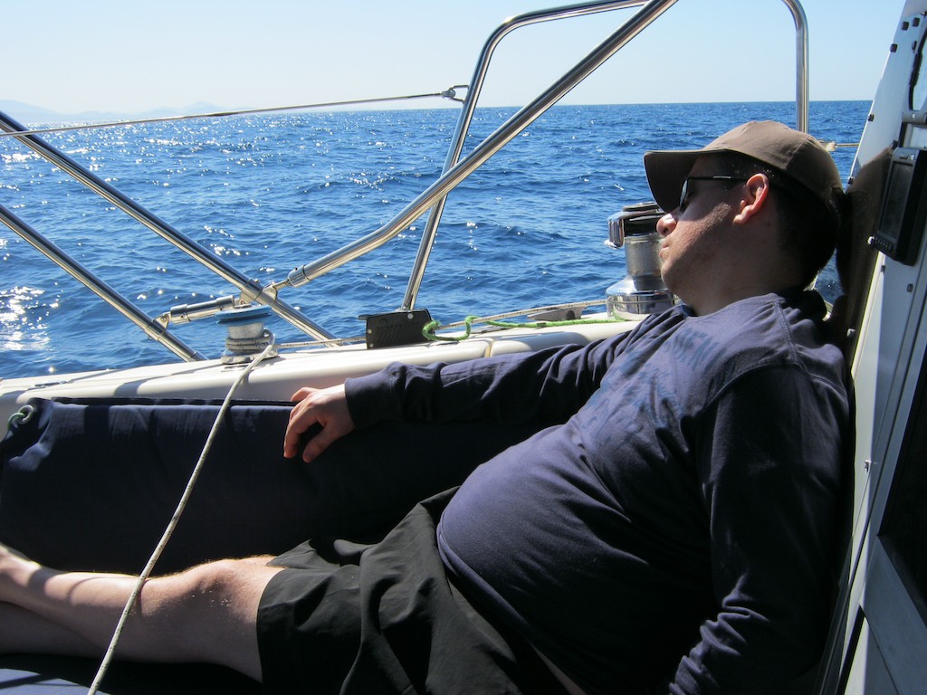 Der Wind sollte gut sein und die Wellen ideal für ein Einschaukeln. Halb zehn legen wir ab. Dani und Gaby auf den billigen Plätzen und ich mache die Arbeit. Segel hoch und raus. Leider ist der Wind genau auf die Nase und auch die Wellen haben kein erbarmen für Dani. Aber alles überhaupt kein Problem. Er schaukelt sich gut ein.