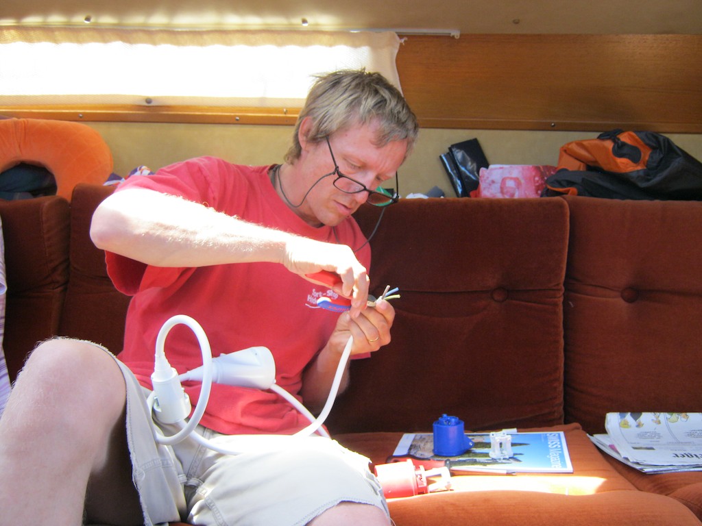 Dort wird gebastelt. Zuerst das Kabel zusammengebaut und dann kommt die Masse dran. Ein weiser, junger Mann hat mir eine eventuelle Lösung für unser immer noch offenes Ladeproblem mit dem Alternator gegeben. Die Masse von der Batterie und dem Motor könnten verschieden sein. Ohmisch zwar verbunden aber Potentialmässig? Das finden wir Heute heraus.