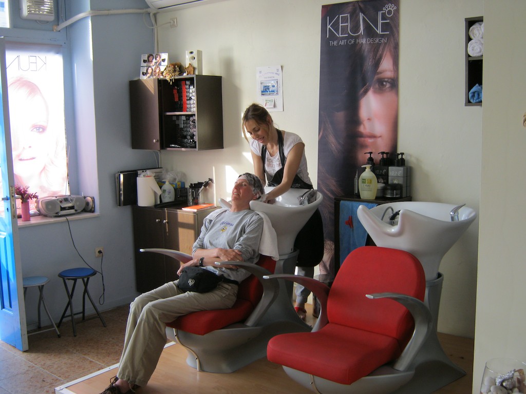 Wir sind in ein Gespräch vertieft, als ich einen schönen Coiffeurladen erspähe. Gaby hängt sofort ein. Entweder auf dem Boot oder da. Kurzerhand laufe ich hin und vereinbare einen Termin in einer viertel Stunden. Austrinken und schon stehen wir vor der verdutzten Coiffeuse. Mit gebrochenem Englisch wird der Schnitt und das Waschen ausgemacht. Mal sehen was da rauskommt.