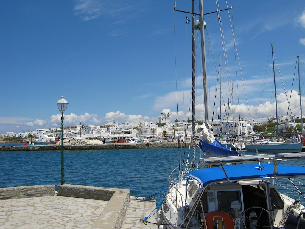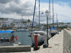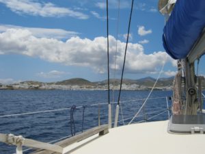Mit etwas Westwind gurken wir zur Nachbarinsel Paros hinüber. Waren wir da schon mal? Wenn wir da sind sag ich dirs, sagt Gaby nur. Der Name der Stadt Naoussa kommt mir schon bekannt vor. Von weiten sieht es uns wie Mykonos aus.