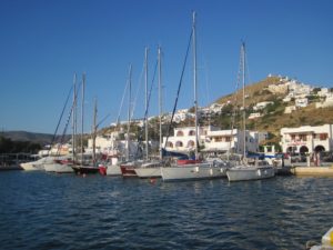 Wow, der Wind stimmt aber präzise. Wir segeln fast aus der Bucht an den kleinen Kykladen vorbei. Dann dreht er aber gegen West und der Motor muss wieder schieben. Nur noch kurz um’s Nordkap von Ios und schon biegen wir in die Hafenbucht ein. Da hat es aber einen schönen …. Gaby strahlt.