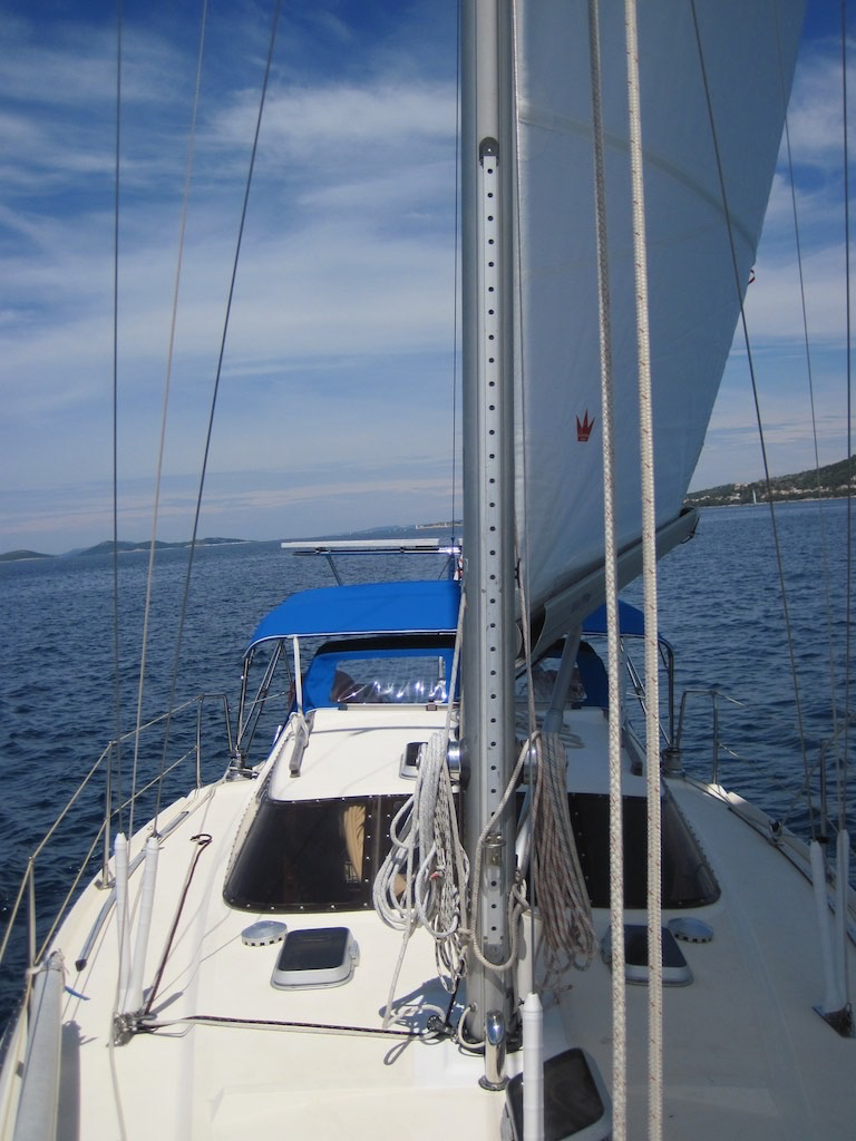 Endlich können wir wieder einmal gescheit segeln. Der Wind ist nicht zu stark und, was viel wichtiger ist, er kommt aus der richtigen Richtung. Alles aufziehen und zum Schluss noch den Windpiloten dazu.