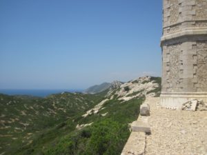 Gar nicht so einfach. Die tausenden von Spinnennetzen bremsen mich und das Gestrüpp, Macchia, wird immer dorniger. Dann endlich bin ich wieder bei Gaby. Der Stuhl muss hier bleiben und so buckle ich sie. Los geht’s. Es wird immer heisser. Dann will sie nicht mehr weiter. Auf dem halben Weg gibt’s eine Pause unter einem Baum und ich mache mich weiter auf die “Suche” nach dem Turm. Endlich taucht er auf.