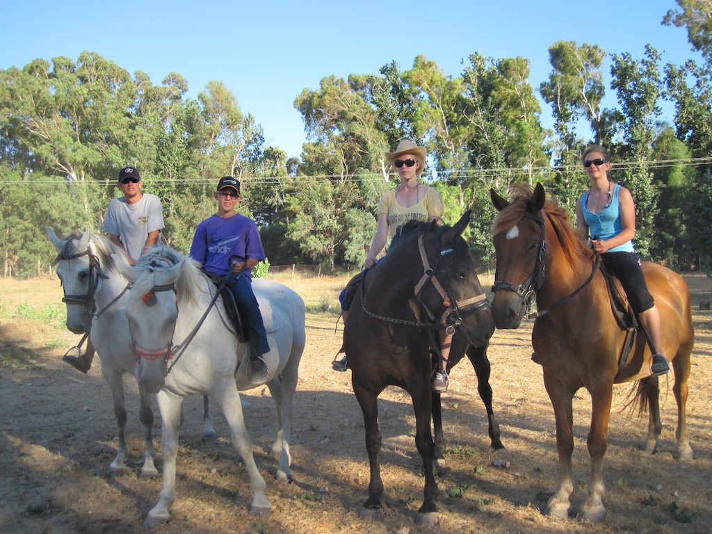 Die Abkühlung hat gewirkt und auch die anschliessende Dusche wirkt wunder. So sind alle beriet für das nächste Abenteuer. Der Taxi kommt pünktlich um sechs und wir quetschten uns in den kleinen Bus. Es klappert und scheppert, aber Mavra ist sehr nett und fährt uns direkt zum Pferdehof. Sie hat viel zu erzählen. So erreichen wir kurzweilig die Koppel am unteren Ende des Flughafens. Unsere Pferde sind schon bereit und warten auf die Zuteilung. Wer kann’s und wer nicht so. Domi erhält den Wildesten. Am Schluss bekommt Jasi den zahmen Ackergaul zum Zug. Sieht doch schon ganz gut aus. Alles bereit?