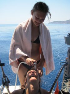 Ohne Wind motoren wir Heute zur nächsten Insel Ithaka. Im Süden soll es eine schöne Bucht geben und die wollen wir uns ansehen. Kurz nach neun Uhr legen wir von der Insel Zakynthos ab und legen den Kurs 330° an. Es ist so flach, dass wir sogar Zeit finden für einen Haarewasch.
