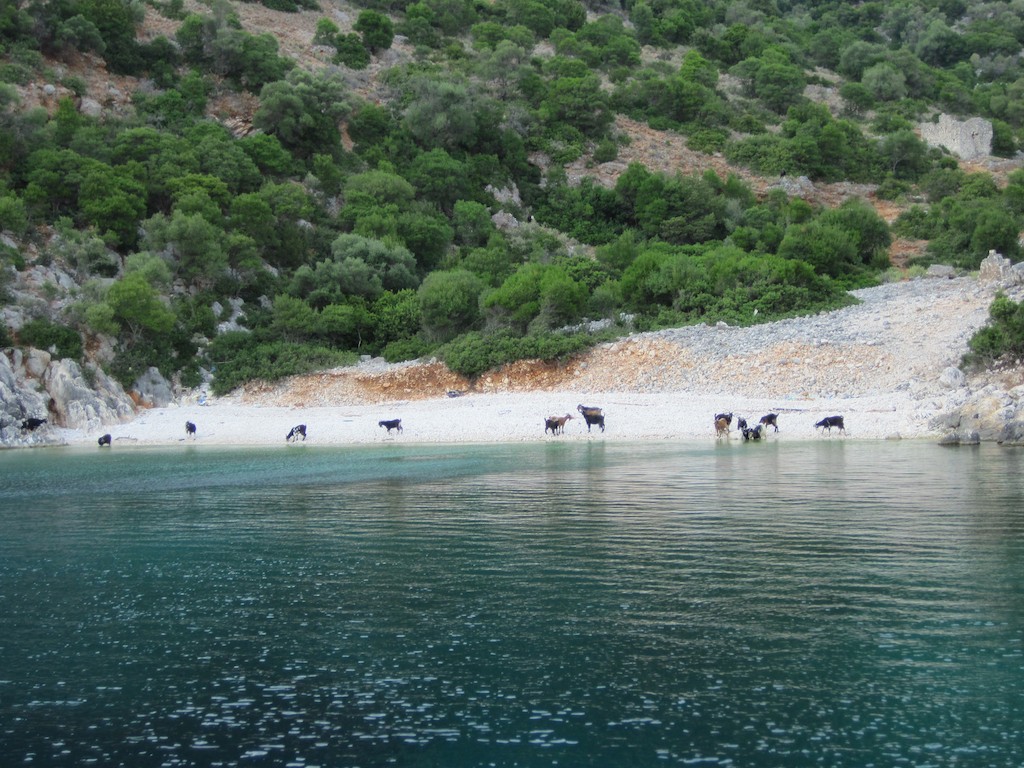 Kaum ist die Sonne untergegangen, kommen die unzähligen Geissen zum Vorschein. Sie verstecken sich während des Tages unter den kühlen Felsen. Jetzt nehmen sie den Strand in Beschlag. Ein spanisches Pärchen hat solche panische Angst, dass sie ohne ihre Habseligkeiten den Strand in Richtung Wasser verlassen. Wir amüsieren uns köstlich.