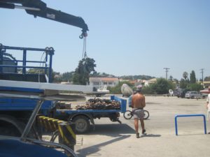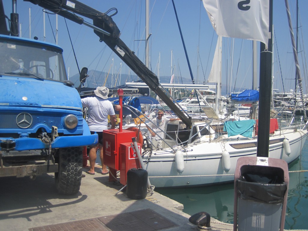 Dann kommt der Kran um ein Uhr. Der Unimog rollt heran und die erste Frage ist, hast du ein Ticket? War für ein Ticket? Für den Kran. Kein Ticket, kein Kran. Ich rausche mit dem Velo los und besorge mir das Ticket in der Office. Es ist eine Anzahlung für die Kranarbeit. Als ich zurückkomme ist das Bimini schon weg und wir können starten.