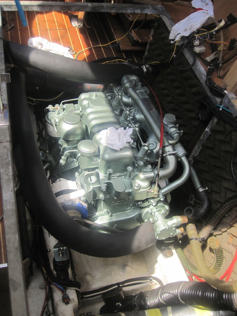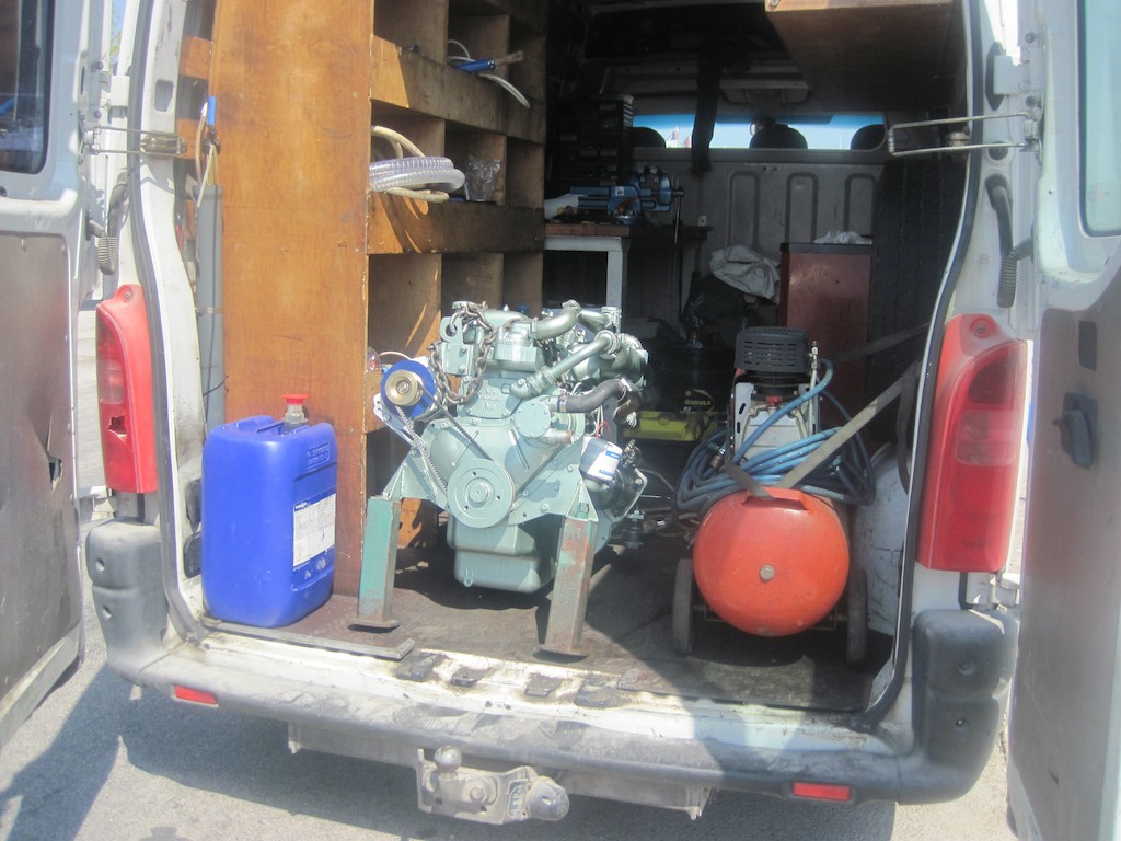 Ich fahre noch kurz zum Mech und schaue mir den Probelauf sehr genau an. Etwas Diesel und etwas Öl. Entlüften. Eine Batterie und der Wasserschlauch als Kühlung. Schon läuft er. Cool!