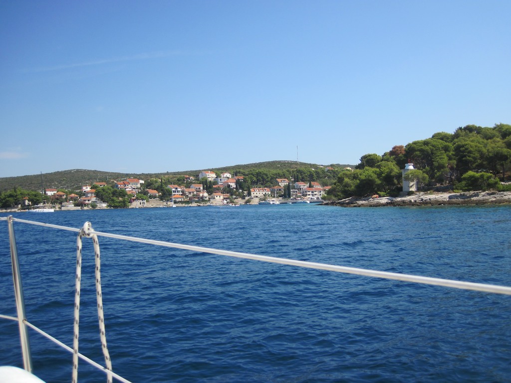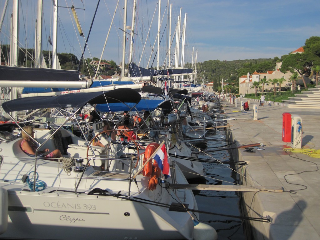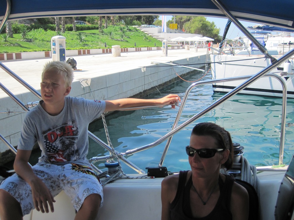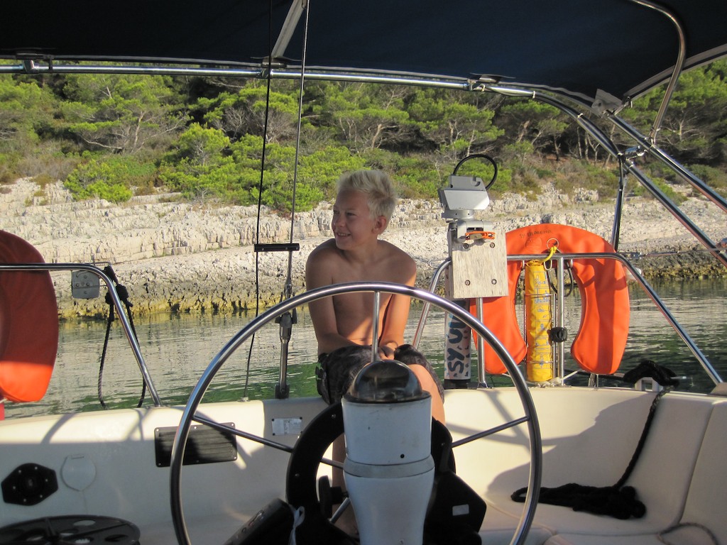 Wir wollen aber zeitig im nächsten Hafen sein. Maslinica ist ja ganz neu und da steuern sicher ein paar andere die schöne Marina an. Joel, bist du bereit? Okay. Schon ist er im Wasser und klettert zu unseren Leinen.