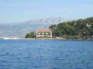 Wind? Ja, aber sicher. 5.2 Knoten aus NordOst. Also wieder motoren. Am schönen Haus des Institutes vorbei in die grosse Bucht hinter Split.
