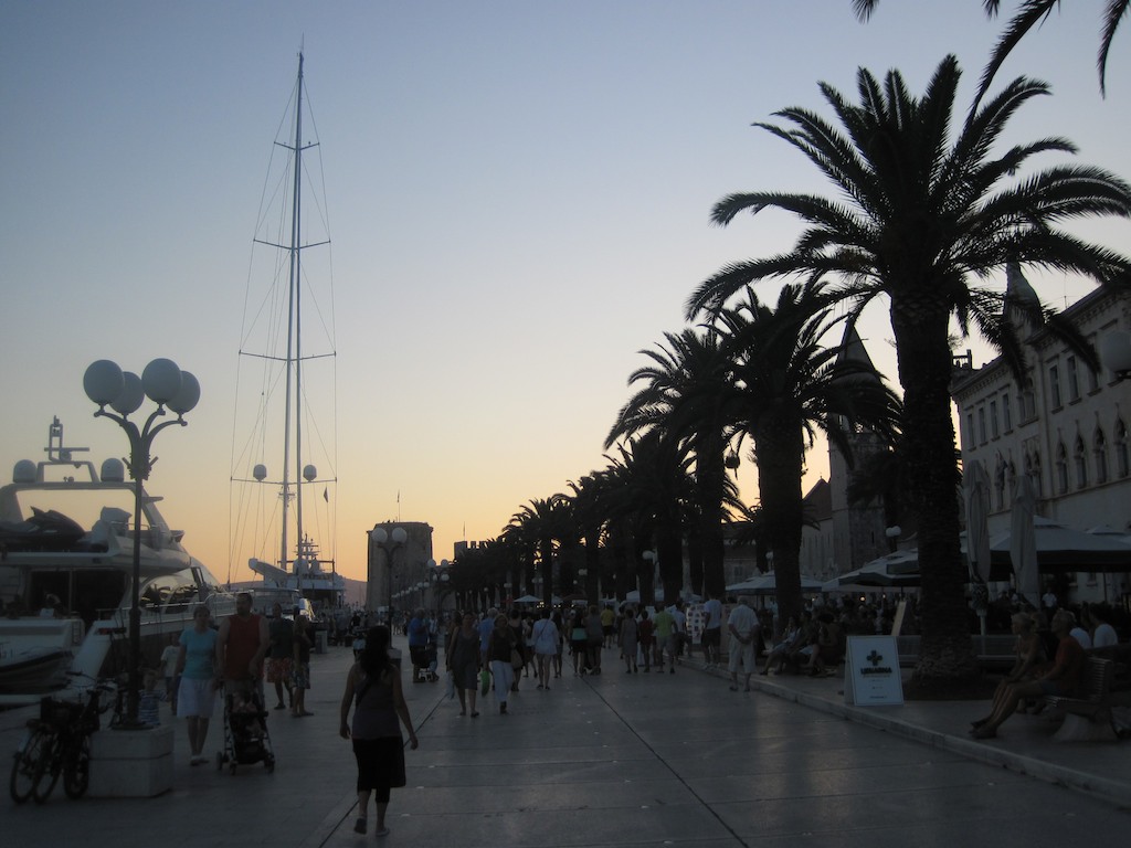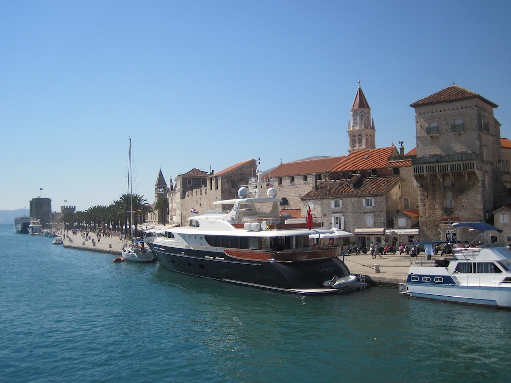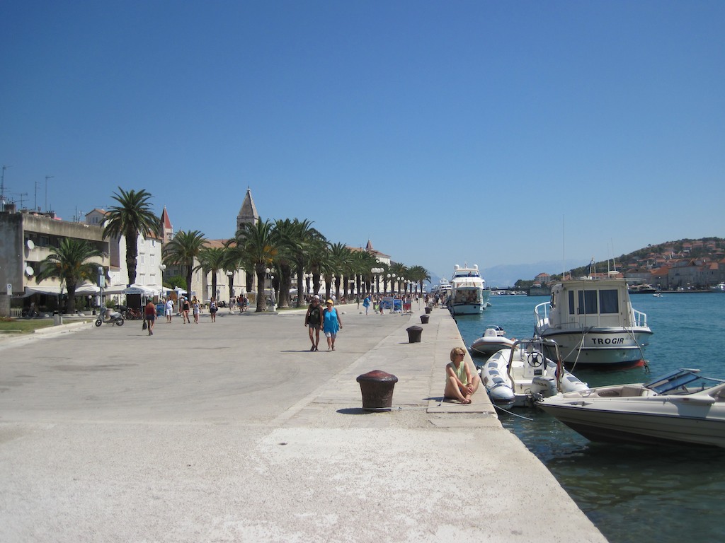 Diese Nacht war gerade umgekehrt. Kein Windhauch und das Wasser spiegelglatt. Wir haben wir die Murmeltiere geschlafen. Wir faulenzen bis fast am Mittag, dann chartern wir (schon) wieder ein Taxi. Zuerst wollten wir mit dem Schiff dort hin, aber die Marina in Trogir sei immer gut besetzt. So machen wir uns mit dem Auto auf den Weg. Wie wird diese neue Stadt wohl sein? Soll ähnlich wie Dubvronik aussehen. Wir lassen uns überraschen.