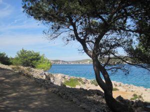 Da geht nichts rum, versuche ich es Gaby zu erklären. Da ist ein Berg, Hügel dazwischen. Was wollen wir jetzt? Hügel oder den gleichen, schönen Weg zurück? Gleicher Weg, sagt Gaby. Mit Aussicht auf die vorgelagerten Inseln machen wir uns zurück auf den Weg nach Jezera. Ja, das war wieder einer diese herrlichen Weg die man einfach per Zufall findet. Eigentlich schade. Aber ich denke die anderen Jachten haben einfach keine Zeit für solche Entdeckungen. Einlaufen, Beiz suchen, Zmorgen essen und ab geht’s zur Badebucht. Wir haben die nötige Zeit, endlich, und geniessen es immer noch in vollen Zügen.
