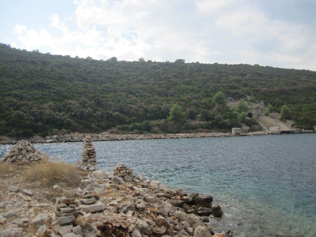 Es wird immer ruppiger und so drehen wir um. Schade. Wieder durch das ganze schöne Dorf auf die andere Seite. Jetzt versuchen wir den Weg in Richtung Veli Rat. Es soll etwa eine Stunde bis zur Soline sein. Mal schauen wir der Weg hier aussieht. Aber auch hier werden wir nach einer viertel Stunde gebremst. Ein richtig schöner Weg, aber für uns hat es wieder zu viele Steine und es geht erst noch bergauf. Am Schluss landen wir auf der Umgehungsstrasse um Bozava und da ist es auf dem Teer sehr angenehm. Es geht plötzlich runter und wir hören das Meer. Fertig Weg! Bei einer Bucht und einem Bunker müssen wir wieder umdrehen. Heute haben wir einfach Pech 😉