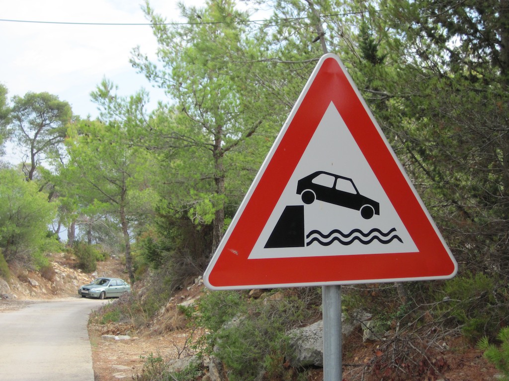 Kurz vor dem Hafen entdecken wir eine weiter lässige Tafel. Ja, da muss man höllisch aufpassen.