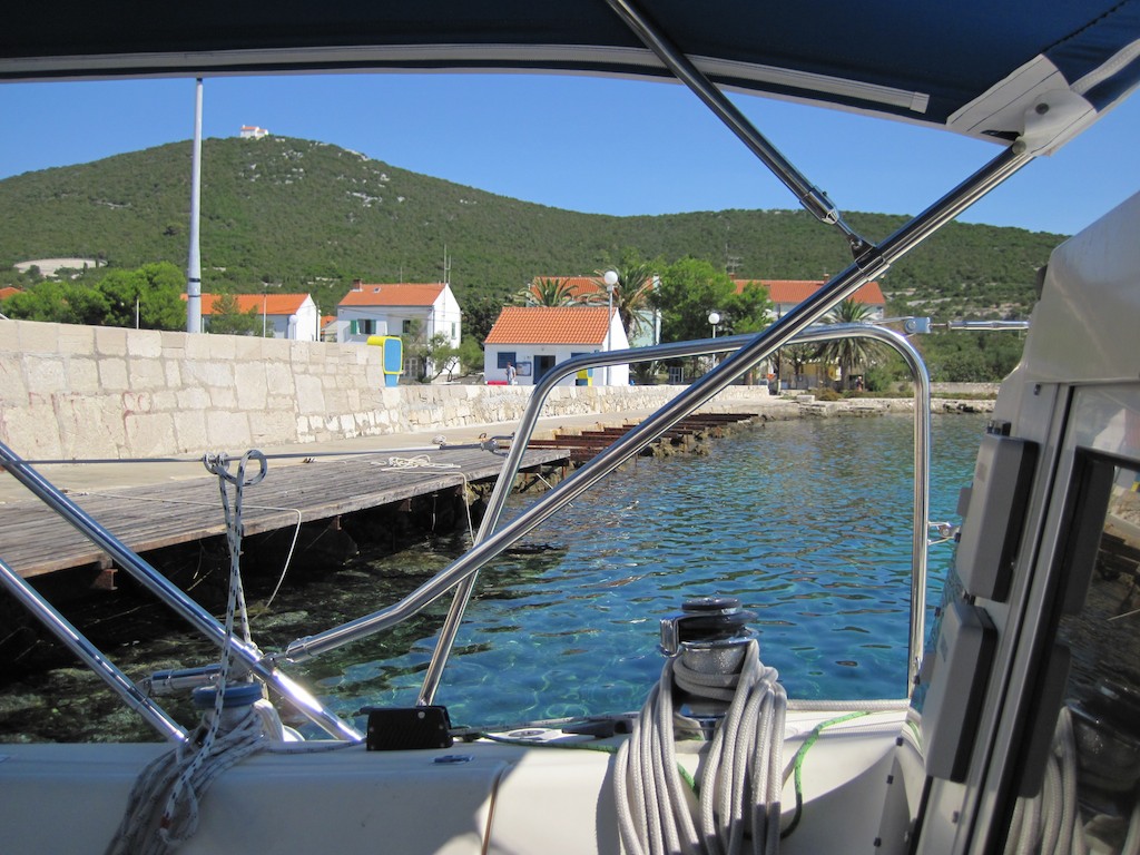 Als wir etwas nach zehn Uhr einlaufen, verabschiedet sich gerade ein Schweizerboot. Wir tauschen kurz die Erfahrung über die Insel aus. Danke für den Tipp. So liegen wir an diesem etwas komischen Steg. Weil das Wasser so blau ist, messe ich mit dem Bootshacken den Abstand: Boden – Ruder. Mehr als genug.