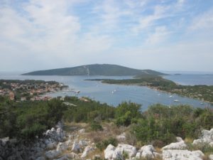 Wir stellen aber fest, das der zweithöchste Punkt der schönere und bessere ist. So erklimme ich kurz den 86 Meter hohen Punkt und mache ein paar Fotos für Gaby. Im Hintergrund die Insel Losinj.