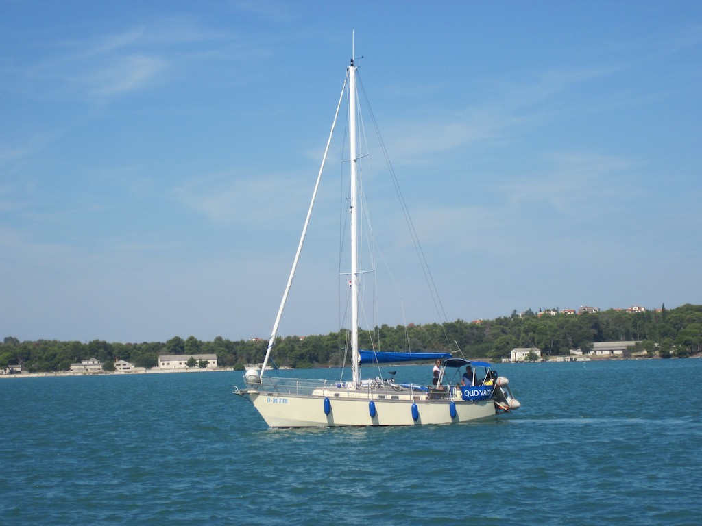 Ausschlafen in der ACI Marina Pula. Die Nacht war ausserordentlich Ruhig. Wir geniessen den Zmorge und ich muss tatsächlich meinen rechten Arm mit Wallwurz eincremen. Das hatte ich ja noch nie! War doch etwas zu viel Tuch gestern. Reffen und etwas langsamer muss in Zukunft die Devise sein. Etwas bloggen und vor allem das Salz von gestern muss ich abwaschen. Kaum bin ich fertig, rauscht schon unser Besuch an der Marina vorbei.