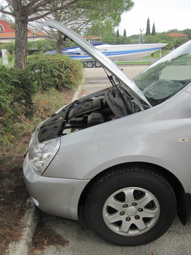 Das Auto wollen wir nach dem Mittag als ersten anschauen. Lebt es noch? Ist die Farbe immer noch grau oder schon erden- oder tannenfarbig? Wir holen den Schlüssel an der Rezeption und rollen zum Auto. Motordeckel auf, Batterie an und … er springt ohne mucken beim erstem mal an.