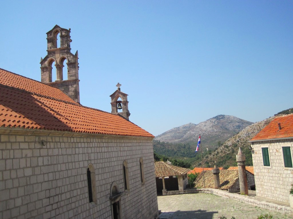Wir suchen eine Beiz. Viel zu heiss, noch länger herumzulaufen. Bei der Kirche hat es immer eine. So rattern wir zum Hauptplatz hinunter und finden mitten auf dem Platz, unter vielen Bäumen versteckt, eine lauschige, lokale Konoba. Keiner da. Gerade kommt eine Frau um die Ecke, Pivo? Frage ich, ja, ja, komme gleich. Mit etwas Schinken und Käse, himmlisch.