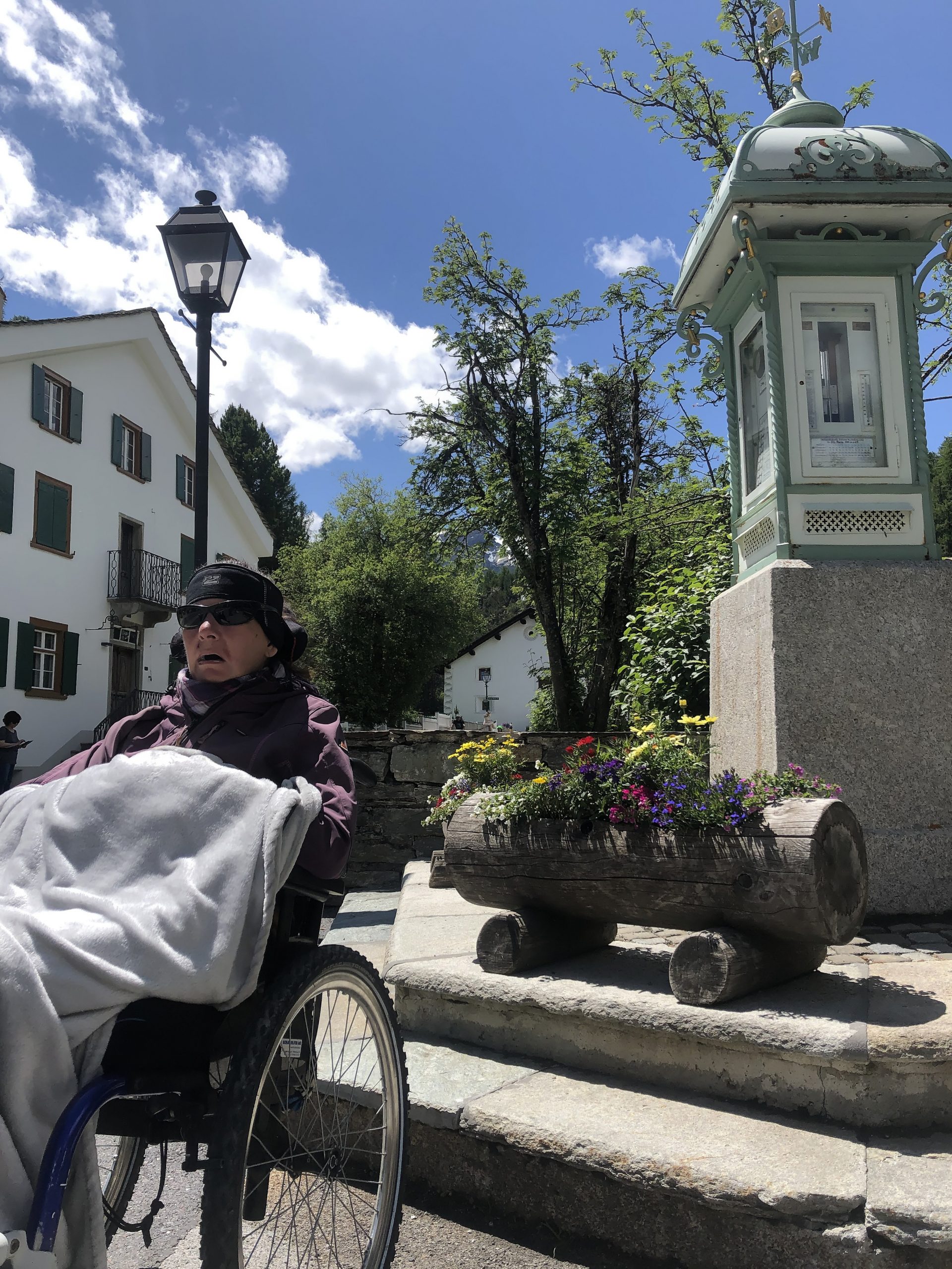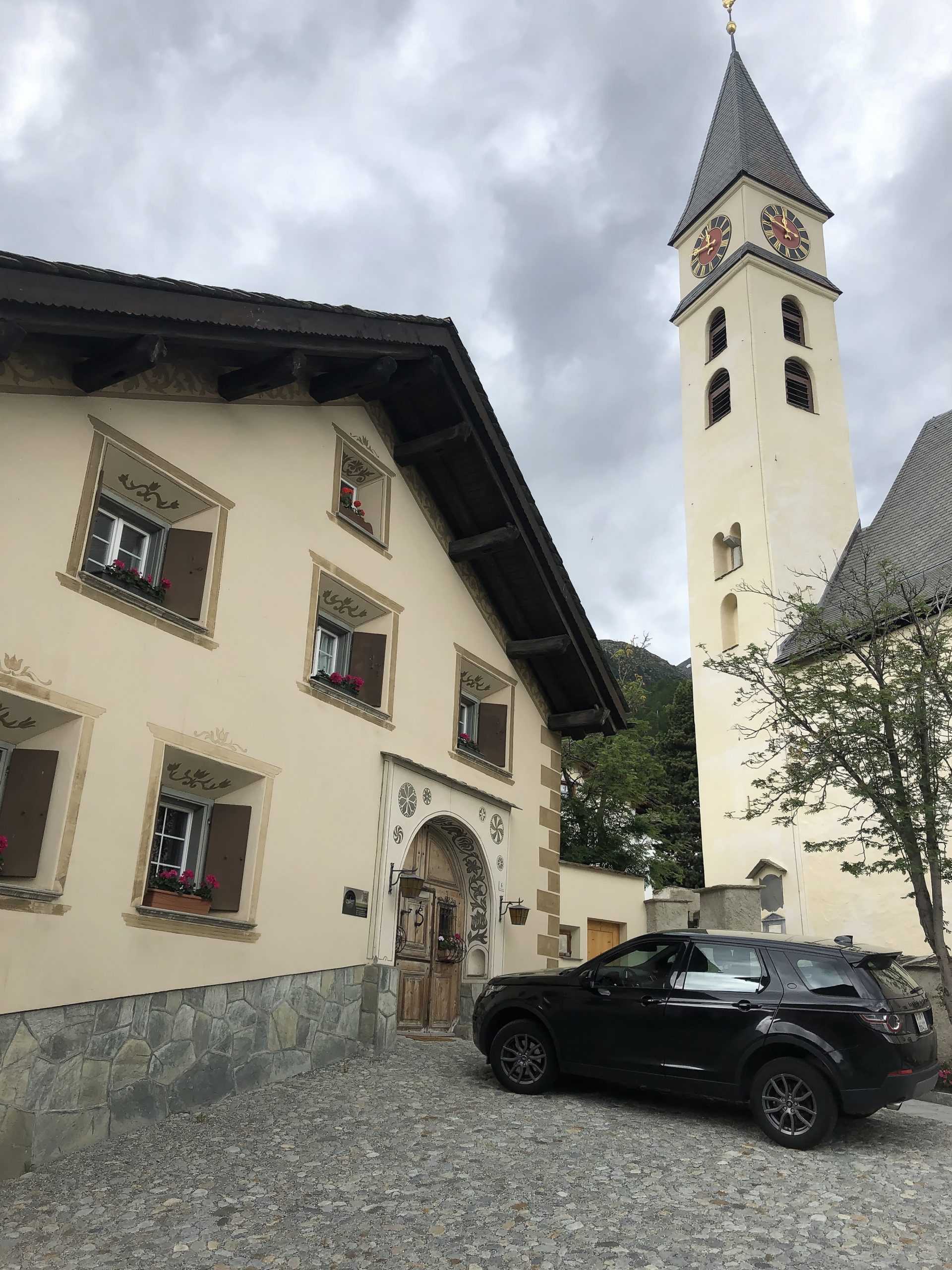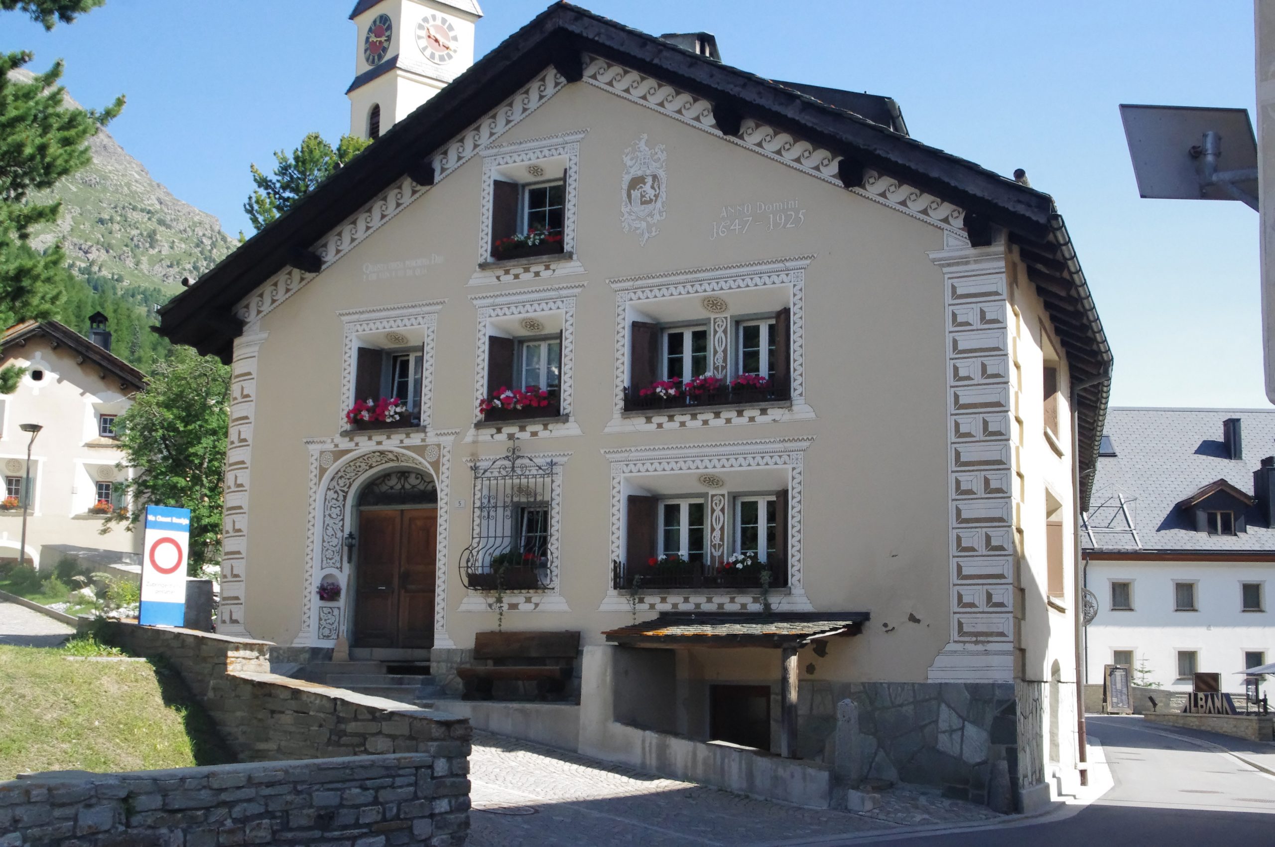 Die nächsten Tag haben wir aber Zeit die diversen “Mängel” zu beheben. So leben wir die ersten paar Tage mit dem Dach unten, eigentlich die “Liegewiese”, auf Wagenhöhe, um unser endloses Puff zu versorgen. Aber dann wird es immer besser und als der “Himmel” sich öffnet, die Liegewiese kommt nach oben, müssen wir nicht immer fast auf den Knien in die Küche kriechen. Dazu müssen wir lernen, wie denn die Markise am besten Montier wird. Hoch oder runter? Weil es auch noch zügig Wind hat, ist die Sicherung zentral. Aber bei Regen in der Nacht, produzieren wir einen See! Super! Bei den Nachbarn sieht alles so einfach aus 😉 Erst als unser Sohn am Wochenende kommt, kriegen wir auch das in den Griff. Einfach nur eine Seite etwas runterlassen – wir kommen uns so blöd vor. Am nächsten Tag sehen wir uns das Dorf Silvaplana etwas genauer an. Die Häuser im Dorfkern sind schon eine Wucht.
