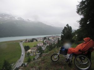 Der Regen kommt aber nicht zu kurz. Unser Platz, also unsere Wiese ist fast leer, denn es ist merklich kälter geworden und der Regen verscheucht die meisten Leute. Heute ist es nicht gar so schlimm mit der Nässe und darum versuchen wir einen neuen Weg. In der Dorfmitte von Silvaplana soll ein Wanderweg über dem Dorf geführt sein. Tatsächlich, fast überhängend, finden wir ihn und staunen ab der herrlichen Aussicht.
