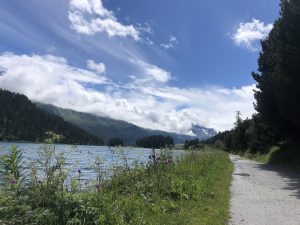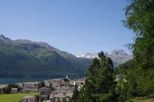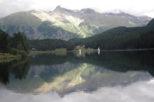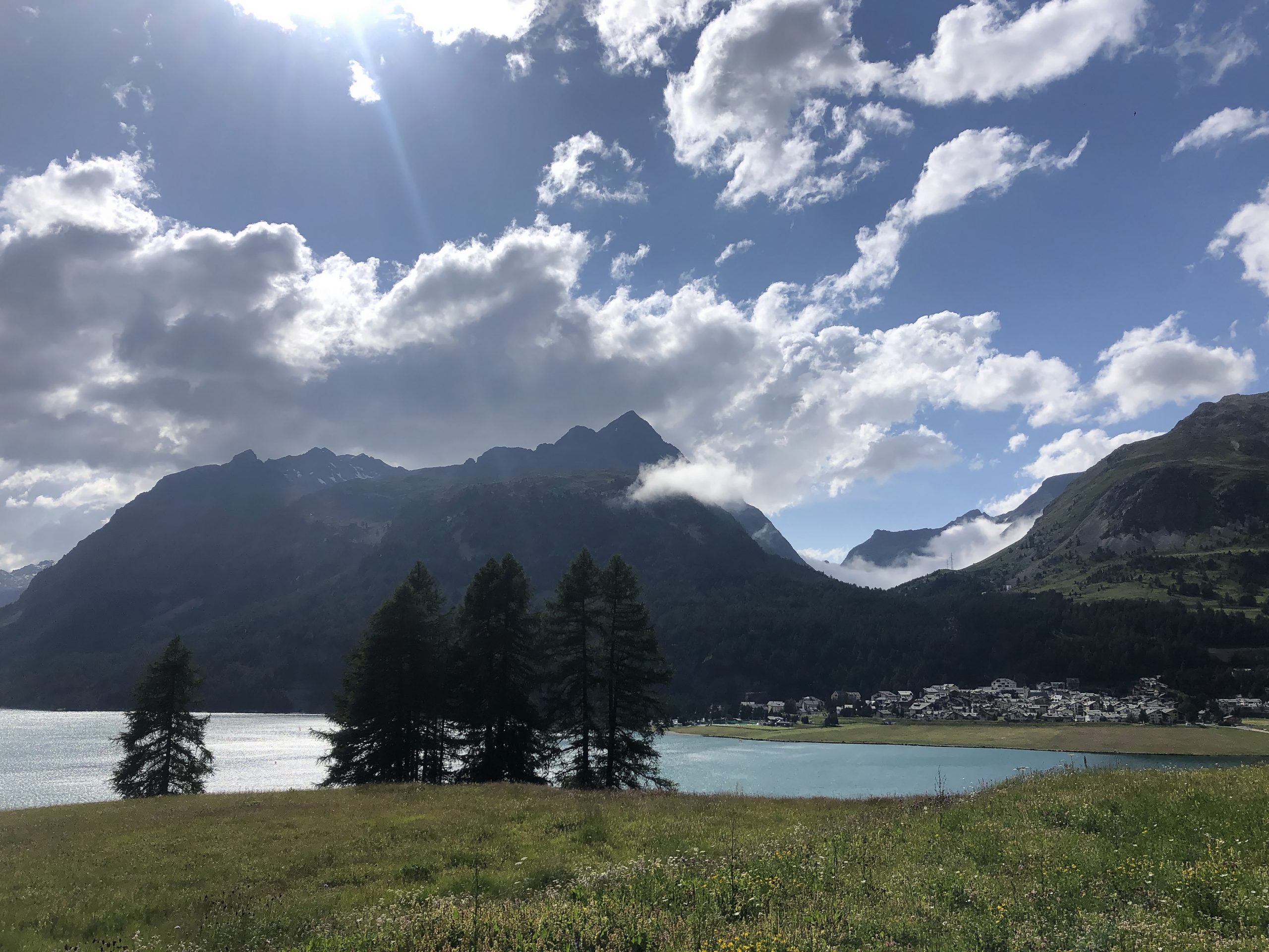 Die rennen also wirklich in dieser Montur durch die Gegend und haben zum Schwimmen noch Hilfen dabei. Ein Teil zwischen den Beinen und kleine Flossen an den Händen. Wir können nur staunen und verfolgen sie fast den ganzen Nachmittag. Immer mal wieder springen sie ins kalte Seewasser und crawlen davon. Faszinierend. Die schnellsten sollen in ein Paar Stunden zurück sein und morgen Sonntag kommen dann die ganz Groben, die acht mal ins Wasser hüpfen! Wir nehmen es lieber gemütlicher und spazieren den Silvaplanersee entlang nach Sils Maria. Dort ein kurzer Rundgang durch das malerische Dorf, bis wir eine Beiz gefunden haben. Schön hier, wirklich schön.