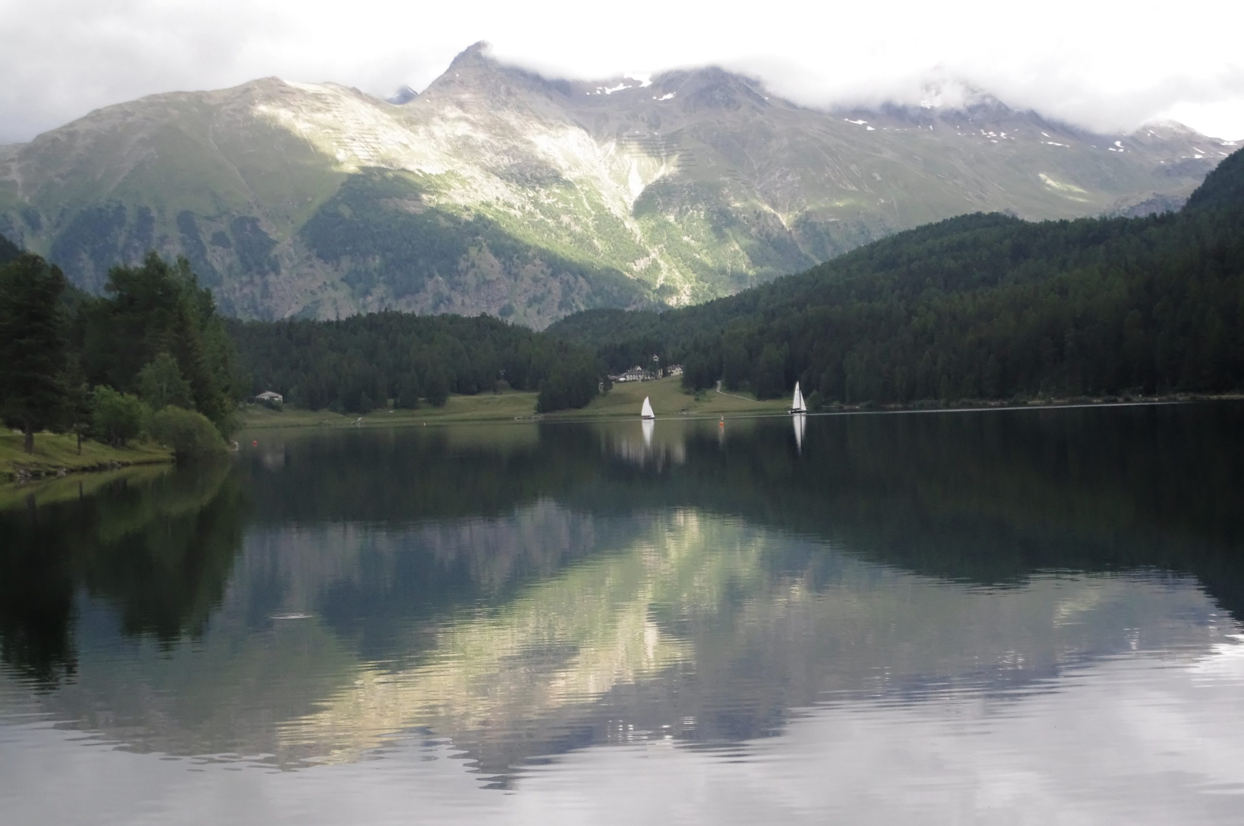 Am nächsten Tag suchen wir einen neuen See. Der soll etwas oberhalb von Surlej sein, das liegt vis à vis von Silvaplana. Nur etwas hinauf auf einem schönen Weg. Doch die Karte stimmt nicht ganz und die ausgewählte Abkürzung ist etwas steiler als angenommen. Kurz in die Hände spucken und oben sind wir. Fast magisch wirkt der Lej Nair. Zwischen den zahlreichen Nadelbäumen gelegen direkt an den Bergen gelegen. Wunderschön!