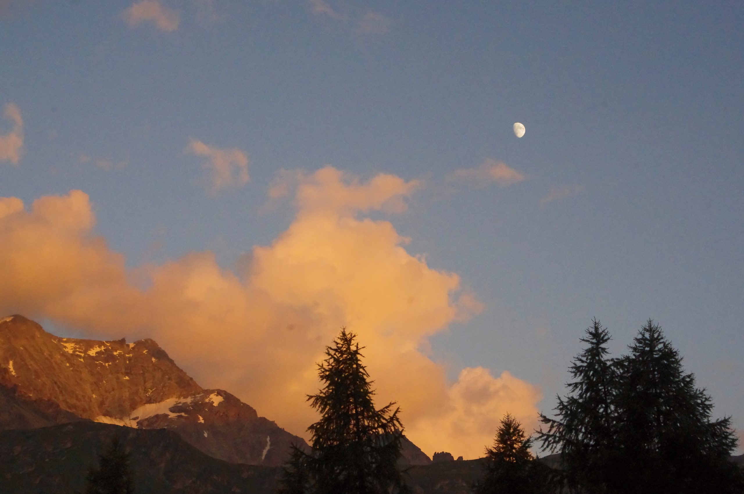 Auch die nächsten schön warmen Tage geniessen wir vollends. Ja, diese zwei Jahre zu Hause fast eingeschlossen zu sein, hat schon etwas gar genagt. Der Kontakt mit den Leuten, so einfach unter den Menschen zu sein, haben wir fast verlernt. Wir müssen es wieder ganz von vorne anpacken, so durch die Welt zu gehen. Umso schöner, dass wir es endlich machen können. Die Abendstimmung ist heute richtig grandios und unser Hausberg zeigt sich in seiner schönsten Farben.