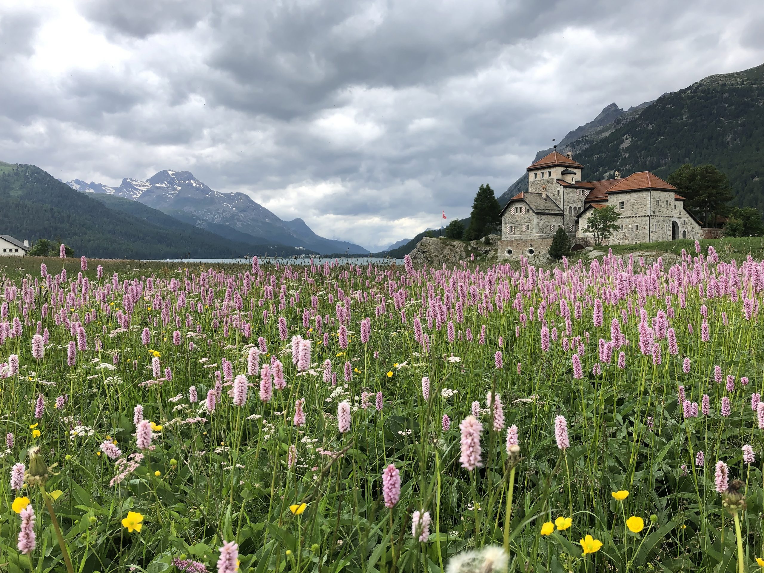 Der Dorfplatz ist wahrlich ein Schmuckstück und etwas weiter unten finden wir einen Volg, in den wir uns mit den letzten Sachen versorgen. Eine Torte mit Nüssen darf natürlich nicht fehlen. Zurück auf unserem Platz geniessen wir die grandiose Aussicht direkt auf den über 3000 Meter hohen Corvatsch. Wir gewöhnen uns langsam an die Höhe, denn es ist über 1800 Meter über Meer, und geniessen die Landschaft und die wunderschönen Spazierwege. Natürlich am See entlang und bei der Brücke dieses schöne Schloss mit den Blumen. Wir sind entzückt von so viel Schönheit.
