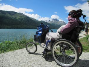 Wir wollen, bevor wir nach Hause aufbrechen, nochmals unseren bei strömenden Regen gefundenen Weg nach Champfèr unter die Räder nehmen. Beim ersten Halt, direkt über dem Dorf, verschlägt es uns fast den Atem! Natürlich auch vom steilen Aufstieg, aber auch durch die phänomenale Aussicht übers Tal, die Berge und den See.