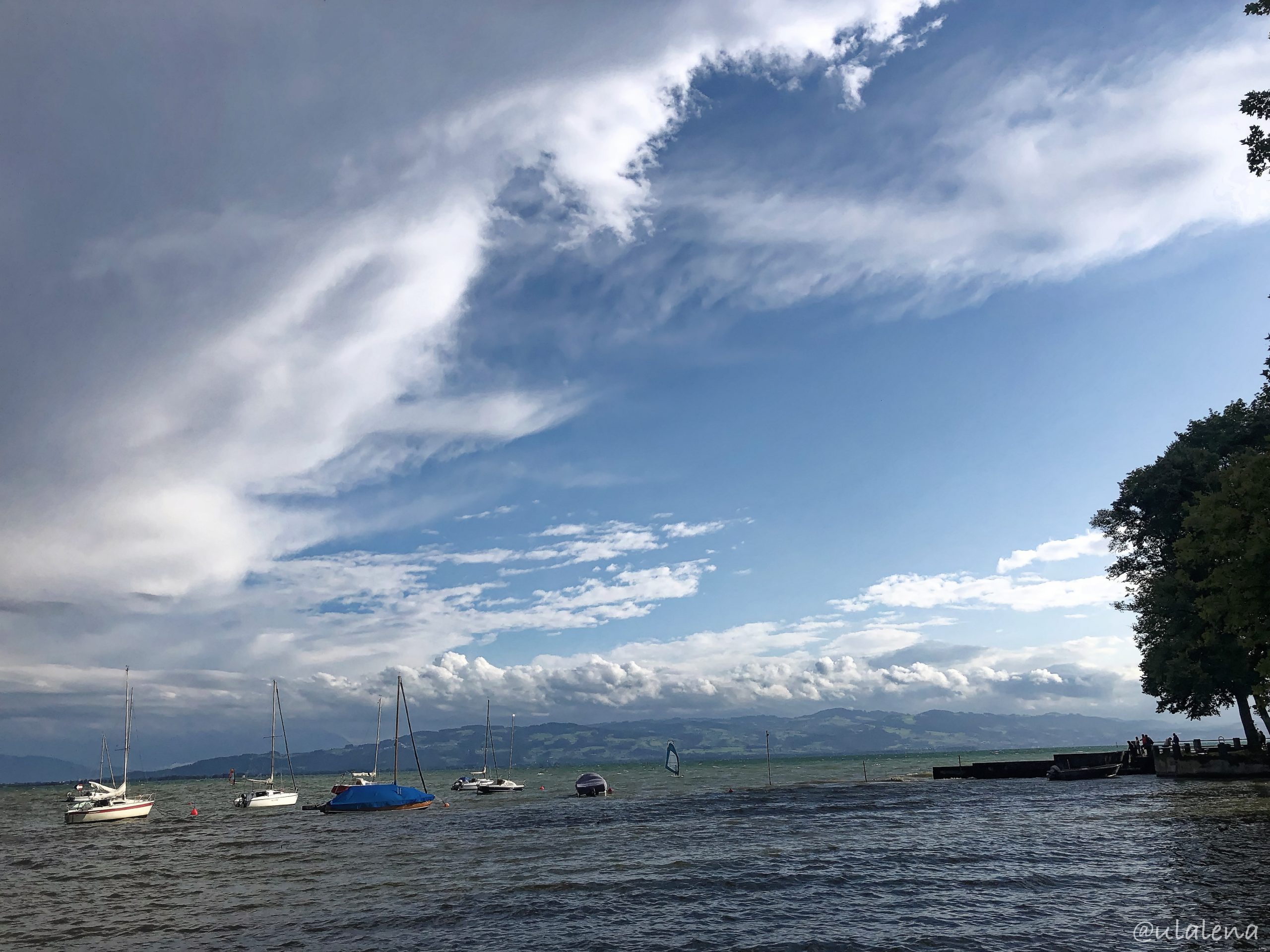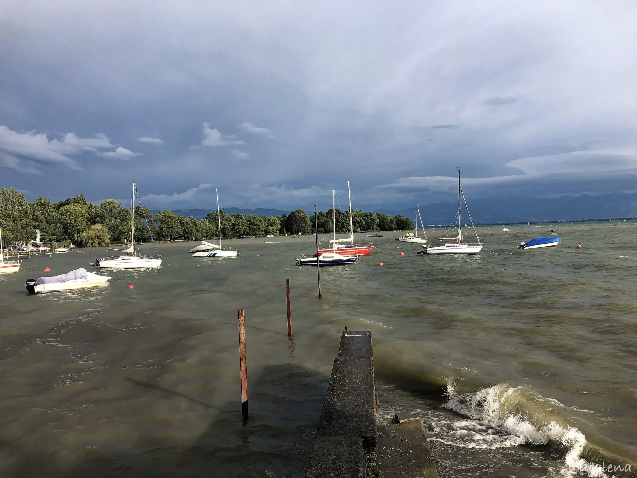 Wir schlafen lang, viel zu lang und kommen nicht aus den Federn. Hier in Silvaplana ist das Wetter zwar immer noch gut, aber frisch. So dauert es ein Weilchen, bis wir warm sind und endlich das Müsli geniessen können. Dann studieren wir den Wetterbericht. Wann sollen wir los? Jetzt? Am Nachmittag? Es kommt mal wieder eine Front und wie schnell die sich bewegt, ist ziemlich ungewiss. So lassen wir uns Zeit für den Zmorge und packen dann unsere Siebensachen zusammen. Noch kurz die wichtigsten Koordinaten im GPS eintragen und schon sind wir im Aufstieg zum Julier. Das Wetter ist ja wunderschön, noch. Wir fahren dem Unterland entgegen und erleben wie die Wetterfront sich ziemlich rasch unserem Standort nähert. So haben wir gute Chancen, trocken am Bodensee anzukommen. Doch zuerst müssen wir einen Weg finden. Wir probieren ohne Maut nach Deutschland zu kommen und finden einfach den Knopf nicht, um diese Strasse mit dem GPS zu umfahren. Es ist nicht, gar nicht der direkte Weg um nach Lindau zu gelangen. Doch wir schaffen es und natürlich treffen wir im vollen Regen beim ersten Campingplatz ein. Anstehen und – voll, alles belegt. Hmm, weiter zum Nächsten. Wir fahren dem grossen See entlang und entdecken zufällig einen kleinen Platz, der gar nicht vermerkt ist. Auch gut. Fragen. Wie lange? Drei, vier Tage? Haben wir nicht, nur für zwei Tage gibt es ein Rechteck für uns. Wir buchen! Die Leute sind super nett, benötigen aber trotzdem ein Zertifikat. Haben wir und lassen uns rein. Gleich nach dem Eingang finden wir unsere Nummer und stellen unseren Van auf die Böcke. Die Wasserwaage checkt Ausrichtung, nicht dass wir wieder mit dem Kopf so runterhängt wie auch schon 😉 Passt alles und so haben wir enormes Glück, das gerade in diesem Moment der Regen nachlässt. Alles steht und wir schnallen den Töff an, um den See zu suchen. Nach ein paar Meter stehen wir fast im Wasser. Die Stimmung ist gewaltig. Richtig “Sturm” hier. Die Warnleuchten blinken und die Wellen, ja genau es hat richtige Wellen, rauschen.