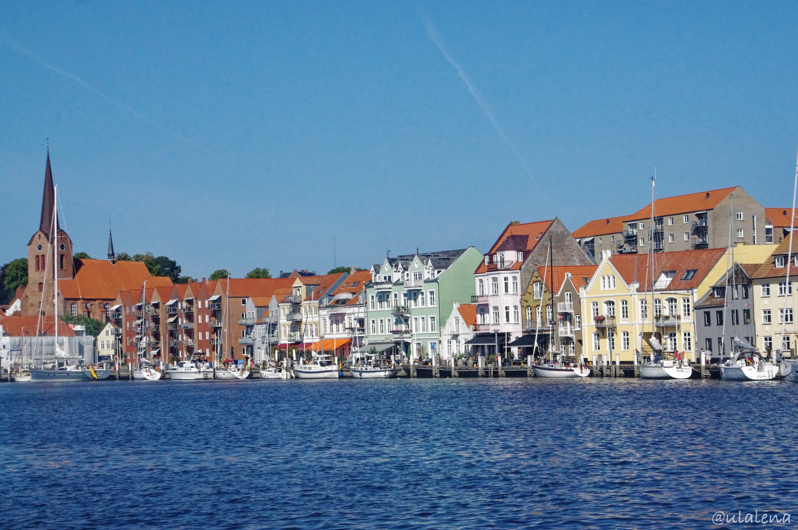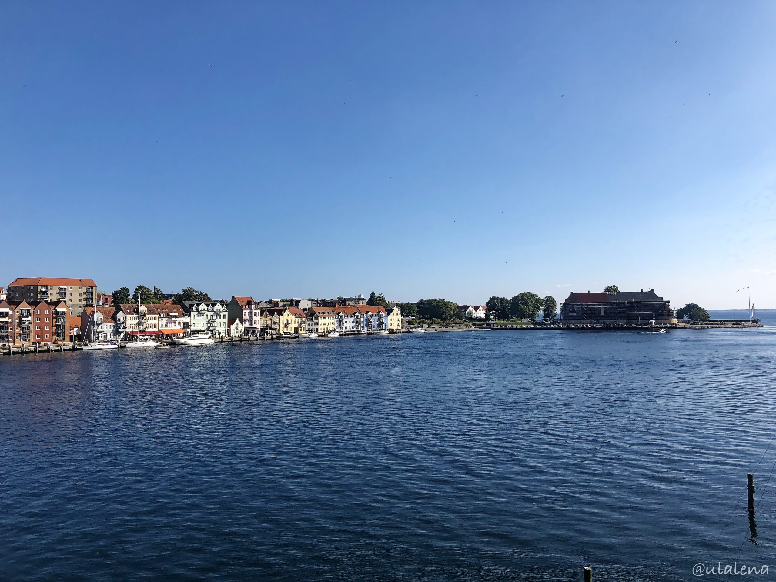 Sonne! Endlich ist sie da! Blau in blau beim Aufstehen. Es ist ein Gedicht. Zeitig stehen wir auf und Frühstücken im grellen Sonnenschein. Um halb elf bezahlen wir die Rechnung und zeihen los. Die Grenze ruft. Der Weg ist sehr, sehr abenteuerlich. Fast auf Feldwegen lotst unser Super Navi vom Van uns ins nächste Land. Durch Kiel und um Flensburg herum rasen wir dem Schlagbaum entgegen. Der Verkehr ist gut und so erreichen wir bald die Grenze. Lassen die uns rein? Welche Dokumente müssen wir zeigen? Eigentlich sollten wir alles dabei haben. Etwas nervös verlangsamen wir unsere Fahrt und fahren langsam zum Zöllner. Nichts? Nö, er winkt nur und schon sind wir zum ersten Mal in Dänemark. Der Verkehr hört schlagartig auf. Von einer auf die nächste Minute sind wir fast die einzigen auf der Spur. Gut so und rechts abbiegen in Richtung Sønderborg. Schon da? Der Campingplatz, fast in der Stadtmitte, macht erst um zwei auf. Also parkieren wir unser Gätzi und machen einen kleinen Spaziergang zum Meer hinunter. Der Weg am Wasser entlang ist fantastisch. Wir geniessen die Sonne in vollen Zügen. Es ist richtig warm hier 😉
