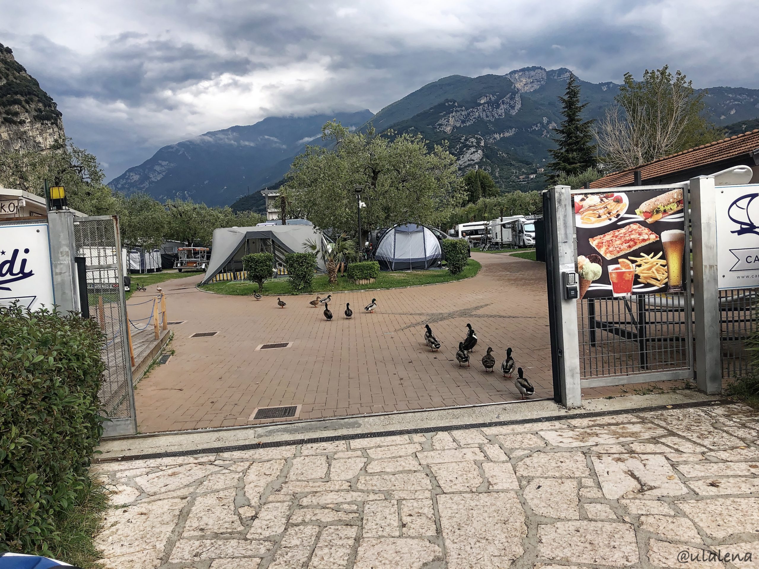Ausgeschlafen haben wir trotz des Windes, des dauernden Regens und den Kontrollen, hält unser Gätzi diesem Wetter auch stand? Ja, tut es. Überhaupt keine Probleme. Beim Frühstück haben wir alles. Wasser, Wind, Sonne und unzählige Wolken. Wir benötigen bis Mittag, bis die Physio durch ist und wir parat sind. Wir wollen, haben wir gestern immer wieder angeschaut, diese Strasse über Riva erkunden. Beim Tor empfangen uns die Enten. Das schöne, saftige Gras auf dem CP ist schon sehr fein.
