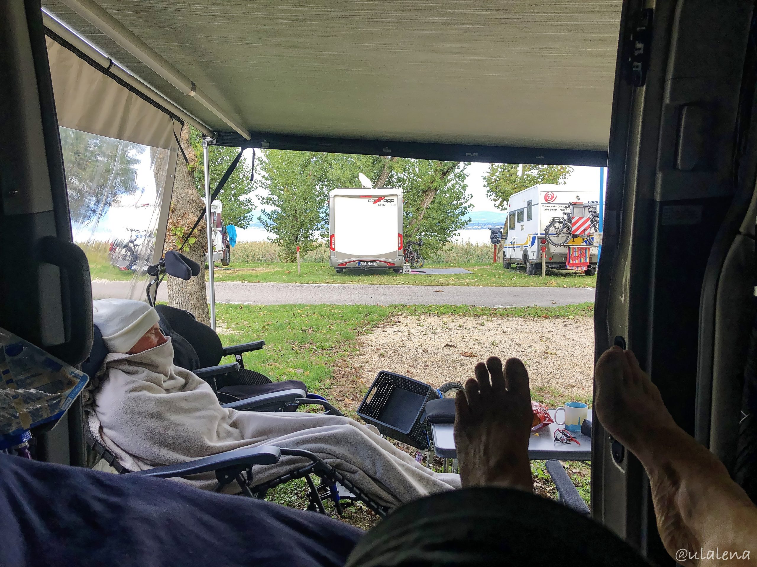 Sonntag. Viel los. Zu den Touristen kommen noch die Einheimischen und so planen wir nicht weit zu gehen. Gleich im Park daneben finden wir ein offenes Kafi mit feinen Brioce. Aber um hereinzukommen, muss das Zertifikat gezückt werden. Kein Problem und wir sitzen drinnen im Warmen. Gaby passt das natürlich und ist extrem happy. Dann müssen wir noch mit unserer Tochter mitfiebern. Sie hat, wenn der Wind, das Wetter auch mitmacht, die Segelprüfung vor sich. Alles passt – sie hat bestanden. Genial gemacht! Als wir zum Bus kommen, sind unsere Nachbarn gerade am Grillen. Wir sagen kurz Hallo und lassen natürlich eine Bemerkung wegen des vielen Fleisches liegen. Parke Gaby im Liegestuhl und verabschiede mich aufs WC. Als ich zurückkomme, hat Gaby einen grossen Teller mit allerlei Leckereien von den Nachbarn erhalten. Wir bedanken uns tausendmal und futtern gleich alles leer. Gaby, die eigentlich den Teller bekommen hat, bekommt nix. Dafür einen feinen Kafi 😉 Im Bus lesen wir noch ein paar Seiten in unserem spannenden, eindrücklichen Buch von Obama.