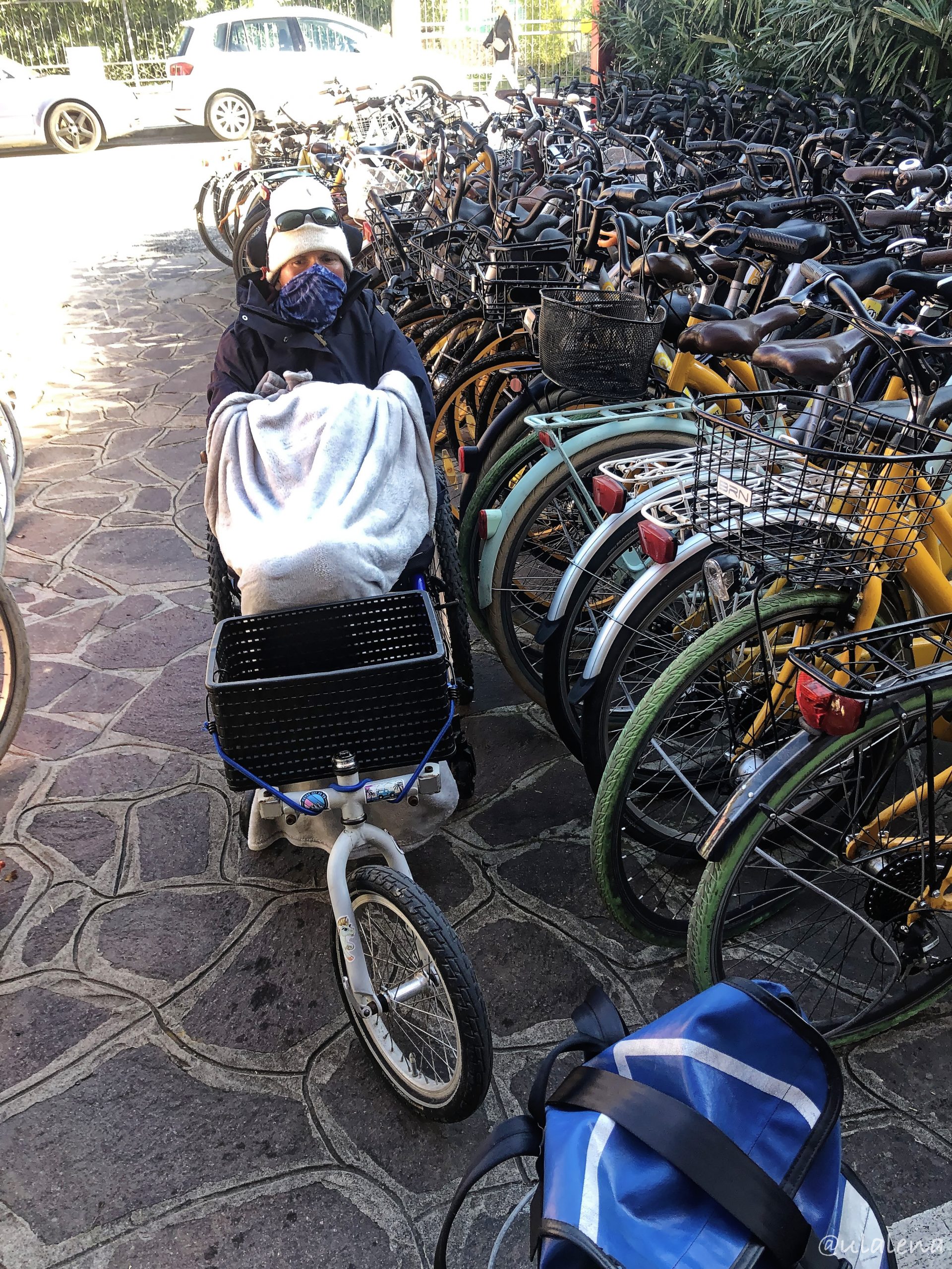 Wir laufen weiter und wundern uns noch, wie sie diese Hecken entlang des Weges scheiden. Das sind ja richtig harte, feste Dornen. Natürlich stosse ich Gaby mittendurch und es kommt, wie es kommen muss, wir fangen mal wieder einen Platten ein. Super! Pumpe dabei, das schon, aber natürlich keinen Ersatzpneu. Auf der Ulalena haben wir hunderte, aber hier, keinen einzigen. So geht die Suche nicht nach einer Glace oder Kafi los, nein wir suchen zuerst einen Velomech. Aber wir werden tatsächlich zügig fündig. Einfach nur fragen und da ist schon einer.